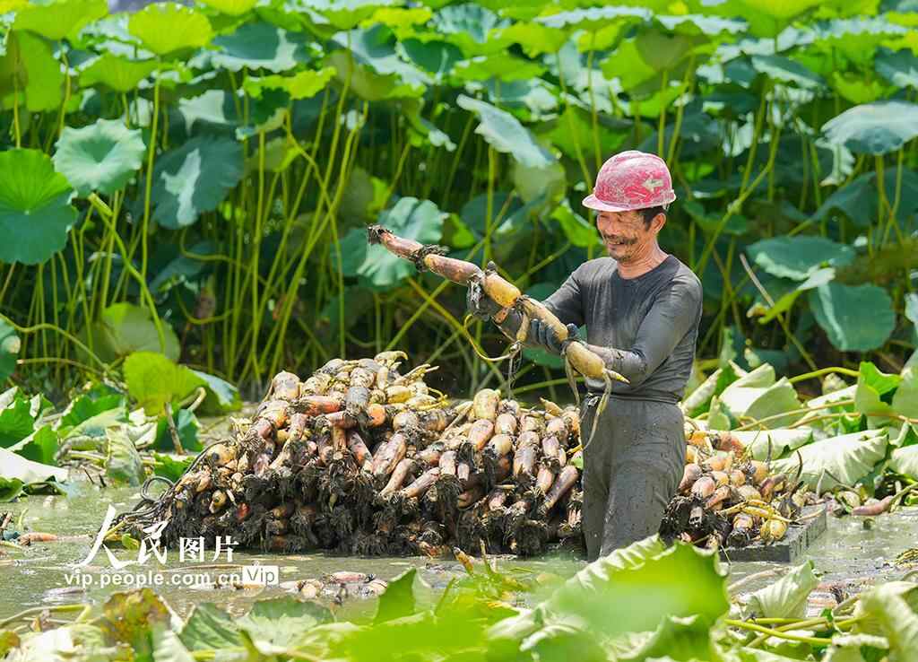 近年来,湖州市长兴县吕山乡积极引导农民调整产业结构,大力发展莲藕产业,推行“党支部+合作社+产业基地+农户”模式,打造和美乡村的同时,带动村民增收致富,助力乡村振兴。陈海伟摄(人民图片网)