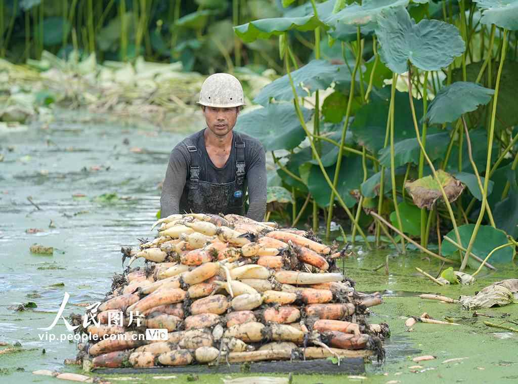 近年来,湖州市长兴县吕山乡积极引导农民调整产业结构,大力发展莲藕产业,推行“党支部+合作社+产业基地+农户”模式,打造和美乡村的同时,带动村民增收致富,助力乡村振兴。陈海伟摄(人民图片网)