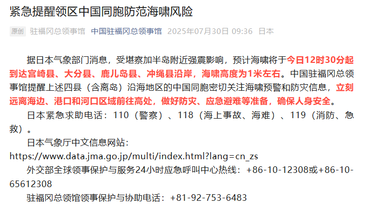 中国驻福冈总领事馆30日发布紧急提醒: