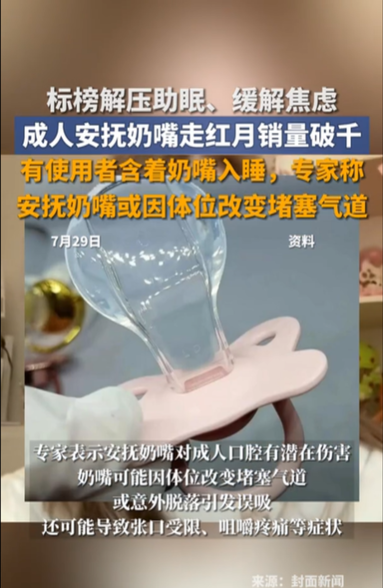 值得注意的是,并非所有的“情绪商品”都能扮演合格的角色。口腔医学专家在接受媒体采访时指出,成人长期含奶嘴,可能引发颞下颌关节紊乱、牙齿错位,甚至造成误吸风险。更有研究指出,不合规的材质可能释放有害物质,危害健康。看似柔软可爱的解压之物,背后可能潜藏不容忽视的隐患。