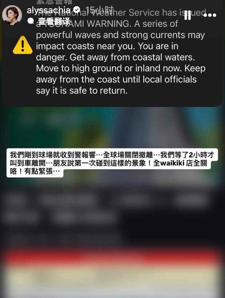 演员贾静雯和三个女儿这几天正在夏威夷度假,她在社交媒体限时动态透露,她们一行人刚抵达球场,警报就响了:“我们刚到球场就收到警报声,全球场关闭撤离,等了2小时才叫到车离开。朋友说第一次碰到这样的景象,全WAKIKI的店都关了,有点紧张……”