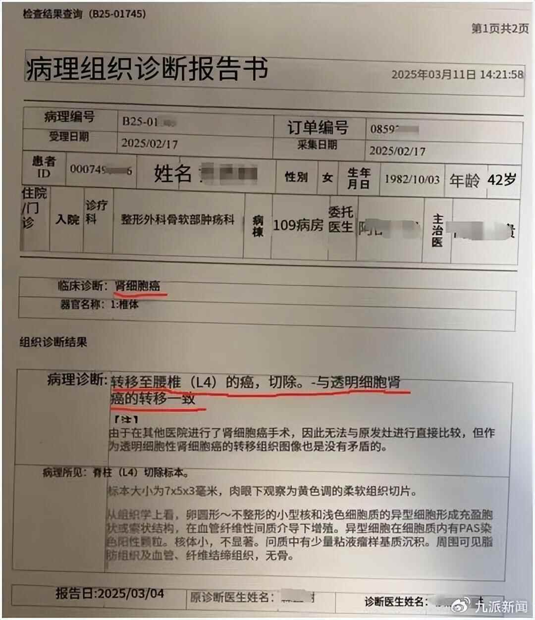 2024年10月,张晓玲在北京大学国际医院被怀疑“右肾透明细胞癌”,进行右肾摘除手术后,病理显示为“透明细胞型肾细胞癌”。由于手术后仍感觉身体不适,张晓玲在2025年2月又到国外的医院进行了检查,结果被确诊为“肾癌骨转移”,而且骨转移已经达到了晚期程度。