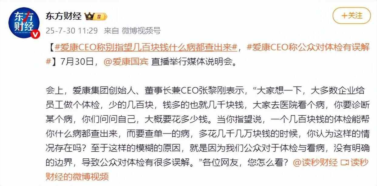 爱康集团创始人、董事长兼CEO张黎刚称,“大家想一下,大多数企业给员工做个体检,少的几百块,钱多的也就几千块钱,大家去医院看个病,你要诊断某个病,你们问问自己,大概要花多少钱。当你指望说,一个几百块钱的体检能帮你什么病都查出来,而要查单一的病,多花几千几万块钱的时候,你认为这样的情况存在吗?至于这样的模糊的原因,就是因为我们公众对于体检与看病,没有明确的边界,导致公众对体检有很多误解。”