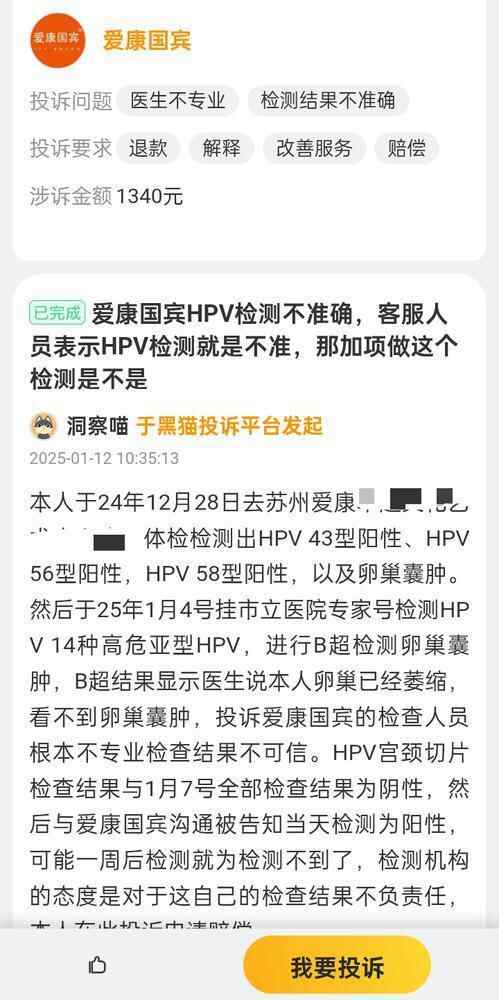 有多位投诉人称在爱康国宾体检数据不准。其中一位称,在爱康国宾的一家苏州分店,2024年12月进行体检,检测出HPV阳性以及卵巢囊肿。2025年1月,她在公立医院进行B超,结果显示,卵巢已经萎缩,看不到卵巢囊肿,HPV检查结果为阴性。