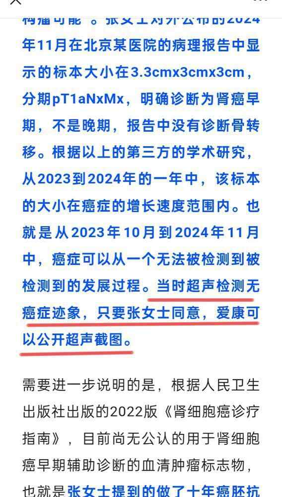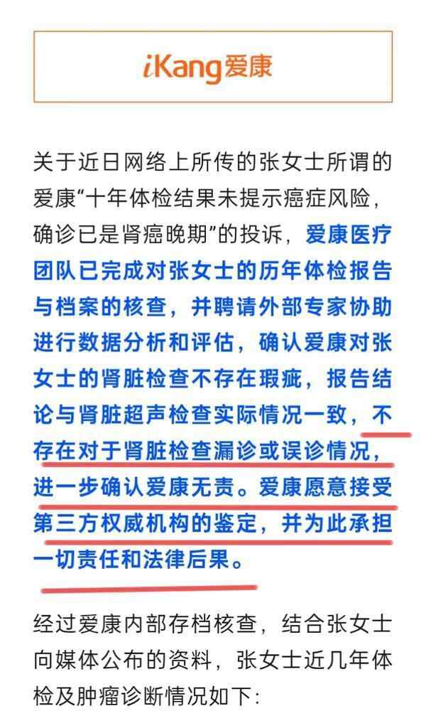 7月18日,爱康国宾公众号两次发布声明称,爱康医疗团队已完成对张晓玲的历年体检报告与档案的核查,并聘请外部专家协助进行数据分析和评估,确认爱康对张女士的肾脏检查不存在瑕疵,报告结论与肾脏超声检查实际情况一致,不存在对于肾脏检查漏诊或误诊情况。并称,爱康完整保留了张女士肾脏超声检查的影像图片文件,只要张女士同意,爱康可以马上公开张晓玲的超声检查影像图片,公开透明,接受医疗专业人士以及公众的审核。