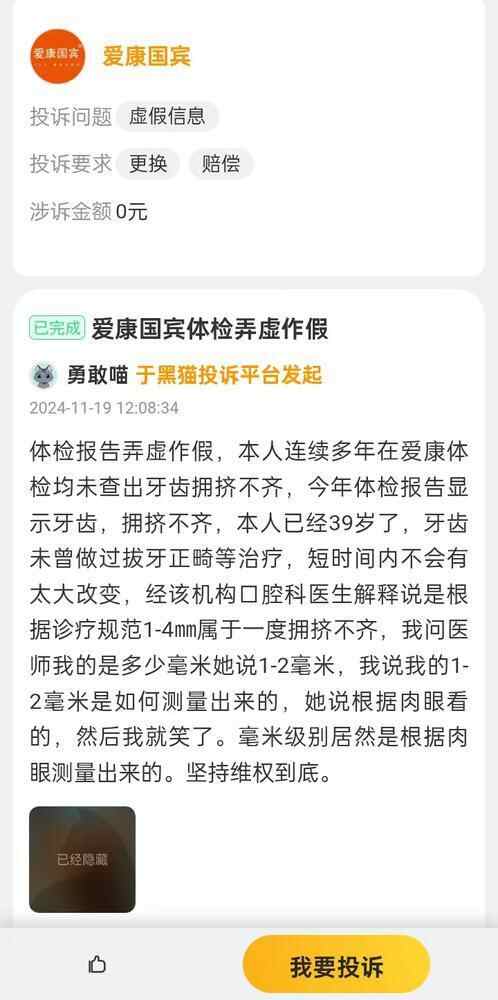 有人投诉,“体检报告涉嫌弄虚作假。本人连续多年在爱康体检均未查出牙齿拥挤不齐,今年体检报告显示牙齿拥挤不齐,本人已经39岁。牙齿未曾做过拔牙正畸等治疗,短时间内不会有太大改变。经该机构口腔科医生解释,是根据诊疗规范1-4毫米属于一度拥挤不齐。我问医师我的是多少毫米。她说1-2毫米。我说我的1-2毫米是如何测量出来的。她说,根据肉眼看的。然后,我就笑了。毫米级别居然是根据肉眼测量出来的,坚持维权到底。”