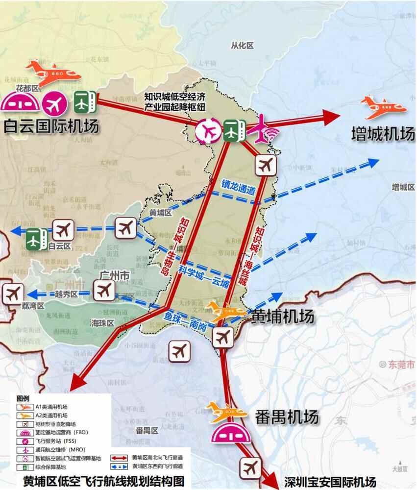 “3+9+N”的低空起降点布局体系,即3个起降枢纽、9个起降场站、N个起降点;构建以“知识城-生物岛”和“知识城-海丝城”为主廊道的“人”字形低空主航道。
