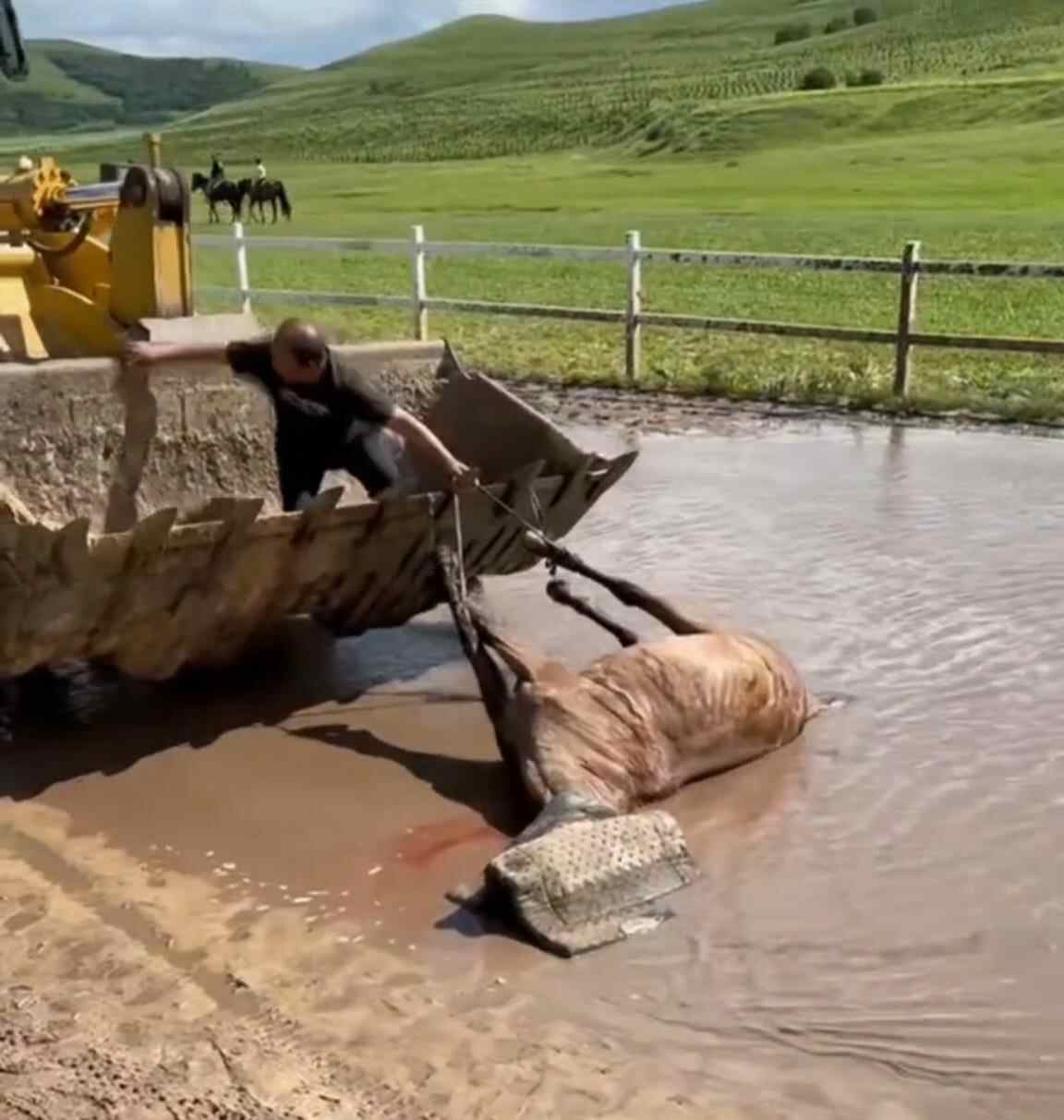 上述网友发布的现场视频显示,一匹马倒在泥泞的积水里,附近有三人或蹲或坐在地上,周边还有许多骑马的人。这匹倒地的马最后被挂在大铲车上拖走。