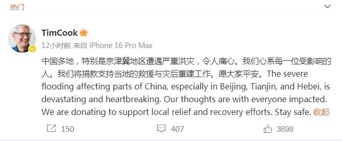 近日,中国多地,特别是京津冀地区遭遇严重洪灾。7月30日,苹果CEO库克在微博发文宣布将为受灾地区捐款,用于救援与灾后重建工作。