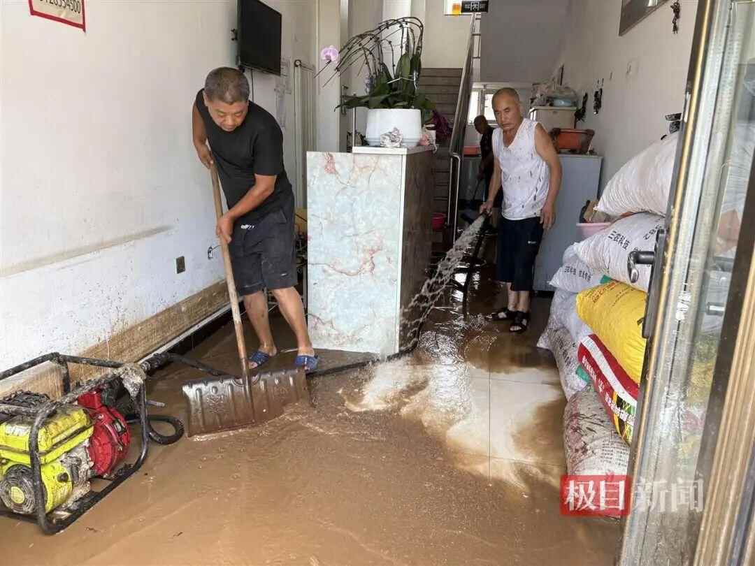 记者看到,一家旅店一楼的墙面上留着一道洪水浸泡后的水印,角落里一台发电机轰隆作响,店里三人正在清理。大厅里一人手拿铲子,一人拿着水枪,配合着将淤泥铲到门外。