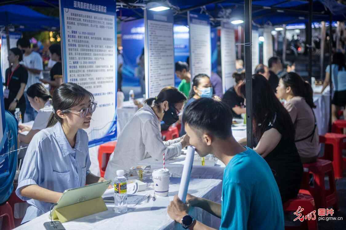 日前,“‘职’夜闪耀 ‘位’你而来”2025年安徽省合肥市暨庐阳区百日千万招聘专项行动夜市专场招聘会在合肥市淮河路步行街百盛广场举行。70余家企业带来家政服务、电商运营、市场营销等优质岗位约2500个,初步达成就业意向300余人。图为求职者在应聘。(葛传红摄/光明图片)