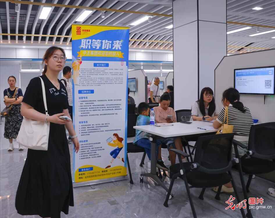 日前,河南省郑州经开区2025百日千万高校毕业生综合招聘会在中原福塔广场举行,100家企业提供了11000多个岗位,涉及机械技术、生物技术、主播、新媒体运营、电商运营、钻铣床工等多个领域。图为求职者在查看招聘信息。(张涛摄/光明图片)