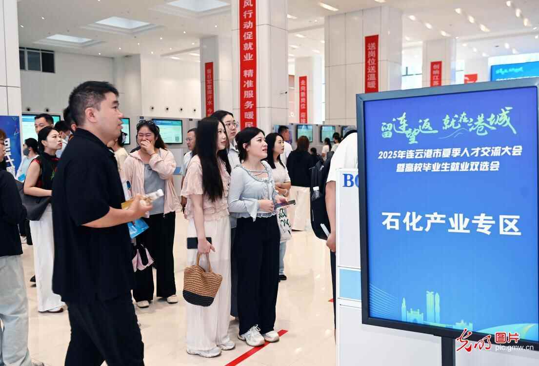 日前,江苏省连云港市夏季人才交流大会暨高校毕业生就业双选会在连云港市人力资源市场举行。现场共有150家名企参会,为求职者提供6000余个岗位,最高年薪50万元。当日,2025年“百日千万招聘专项行动”江苏经贸企业专场招聘活动同时开展。来自无锡、徐州、淮安等省内的21家优质经贸企业参会,提供了销售工程师、机械工程师、生产技术员岗位316个。(朱德富摄/光明图片)