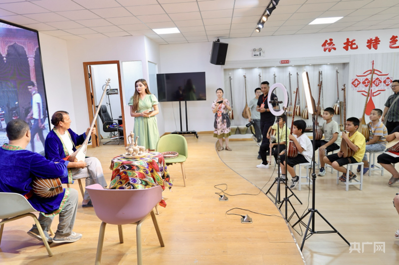 央广网阿克苏7月30日消息(记者梁瑜琳 丁安)7月27日,记者跟随“石榴花开 籽籽同心铸牢中华民族共同体意识”网络主题活动,走进新疆阿克苏地区新和县加依村。在自治区级乐器传承人努尔东·司马义的院落里,都塔尔琴弦调音声交织成曲,身着民族服装的当地艺人正随着琴弦跃动,与游客即兴共舞。