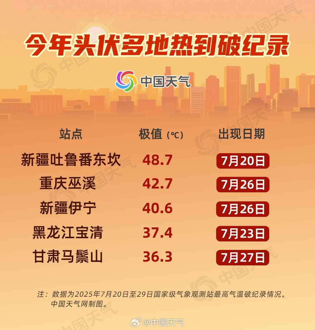 今年三伏虽是30天短版,但热力仍不可小觑。头伏期间(7月20日至29日),新疆、重庆、黑龙江、甘肃等地多个气象站气温突破历史极值。其中新疆吐鲁番东坎最高气温达48.7℃,“炎值”爆表,伊宁最高气温达40.6℃,酷热难耐,甘肃马鬃山最高气温达36.3℃,均打破当地观测史最高气温纪录。重庆巫溪和黑龙江宝清分别达42.7℃和37.4℃,打破当地7月最高气温历史纪录。