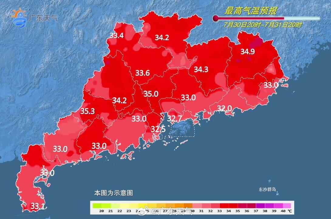 7月31日,广东大部市县多云到阴天有中(雷)阵雨局部(大)暴雨。最高气温:全省大部分市县介于32℃~35℃。