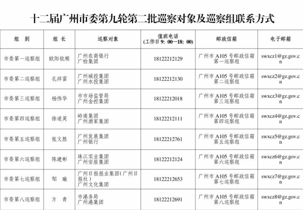 根据广州市委关于巡察工作的部署,十二届市委第九轮巡察采取“一轮两批次”方式对24个市直单位党组织开展常规巡察。截至7月30日,市委8个巡察组已进驻第二批巡察的市市场监管局、市港务局、广州城投集团、广州水投集团、广州港集团、珠江实业集团、广州酒家集团、广州发展集团、岭南集团、广检集团、广州安居集团、广州银行、广州农商银行、广州金控集团、广州日报报业集团(广州日报社)、广州文化集团等16个单位并召开进驻动员会。