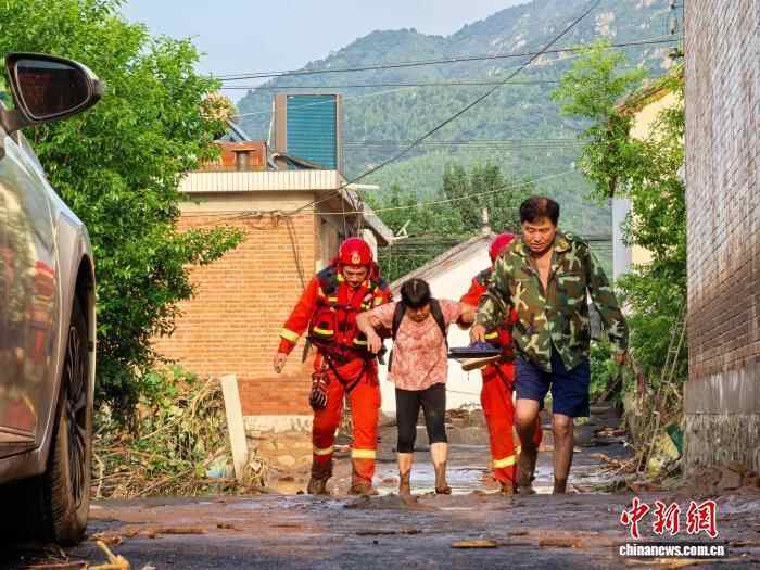 7月28日,北京密云太师屯镇葡萄园村,救援人员协助民众撤离。中新社记者 吕少威 摄