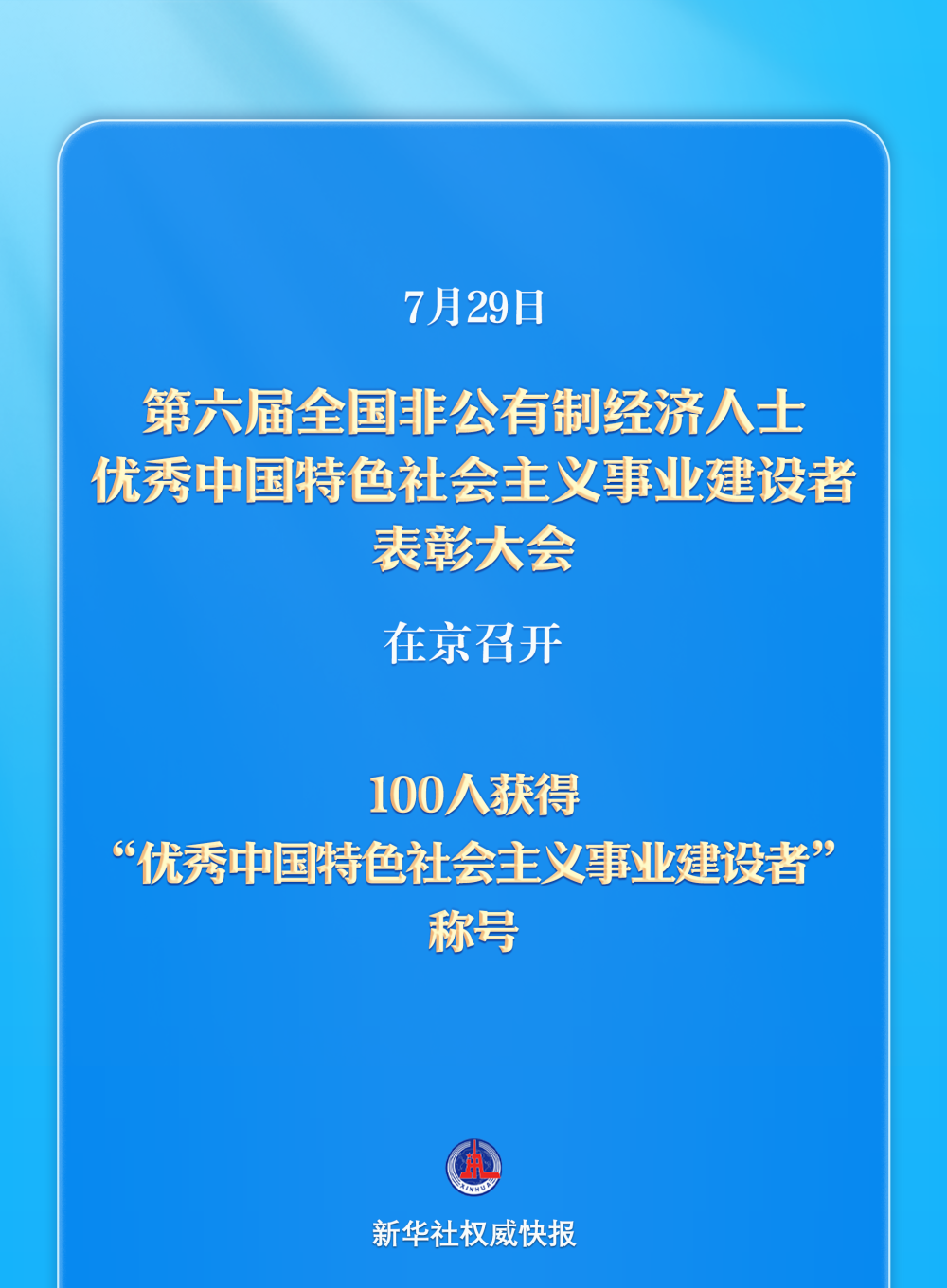 7月29日,第六届全国非公有制经济人士优秀中国特色社会主义事业建设者表彰大会在京召开。会上,100人获得“优秀中国特色社会主义事业建设者”称号,进一步激励广大非公有制经济人士坚定理想信念、保持发展定力、勇担时代重任,凝聚起团结奋进的强大力量。