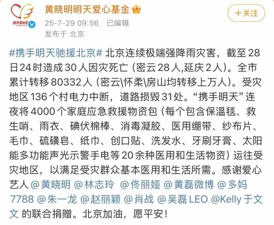 感谢爱心艺人黄晓明、林志玲、佟丽娅、黄磊孙莉夫妇、朱一龙、赵丽颖、肖战、吴磊、于文文的联合捐赠。