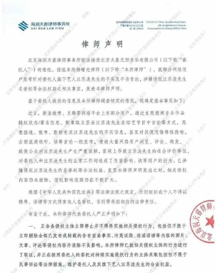 声明还称:“正告各侵权主体立即停止并不得再实施相关侵权行为,包括但不限于立即删除全部已发布或转载的含有歪曲事实、污蔑诋毁、造谣诽谤等内容的图片、文章、评论等侵权内容并消除不良影响。本所律师已就相关侵权主体的行为进行了取证,并正在按照委托人的委托对持续实施侵权行为的主体采取包括但不限于民事诉讼等法律措施,维护委托人及其旗下艺人汪苏泷先生的合法权益。”