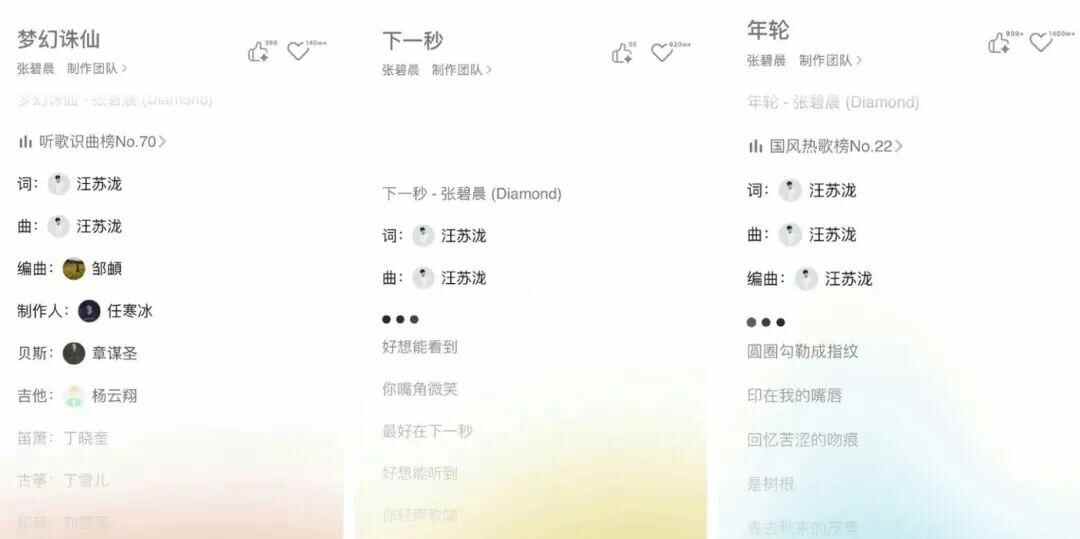 有网友反映,网易云音乐取消了张碧晨《年轮》《梦幻诛仙》《下一秒》三首歌的原唱标识,三首歌均为汪苏泷作词作曲。