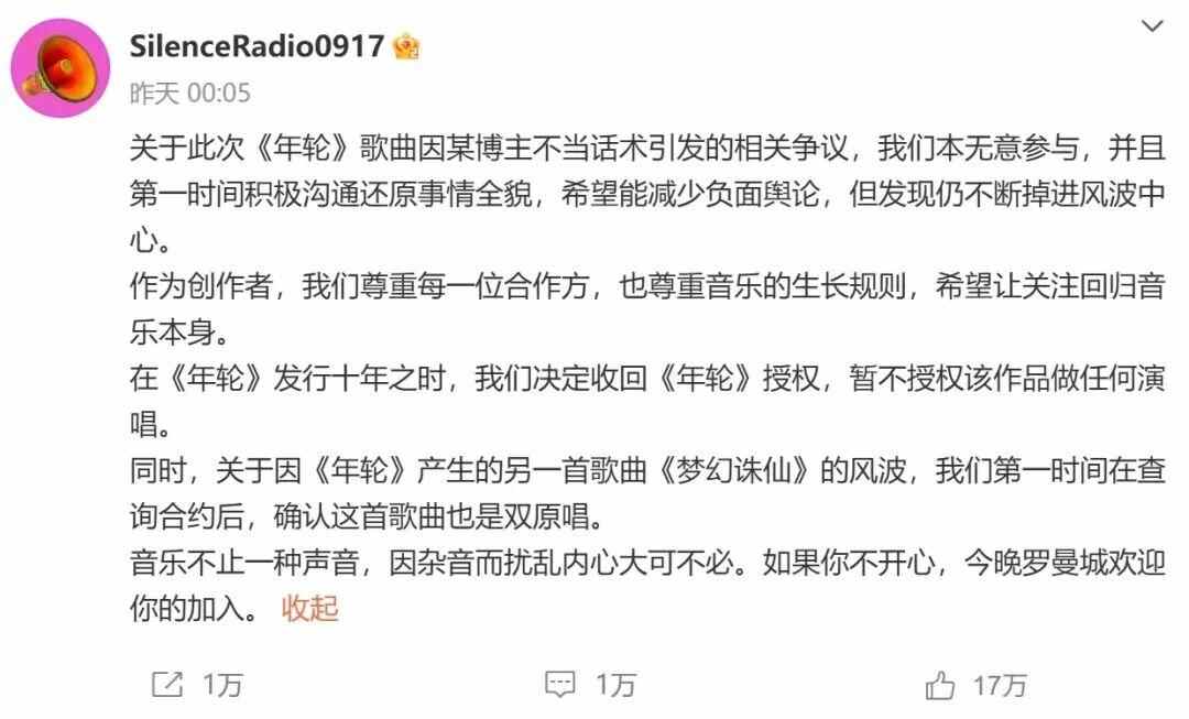 汪苏泷方发文称:“在《年轮》发行十年之时,我们决定收回《年轮》授权,暂不授权该作品做任何演唱。”