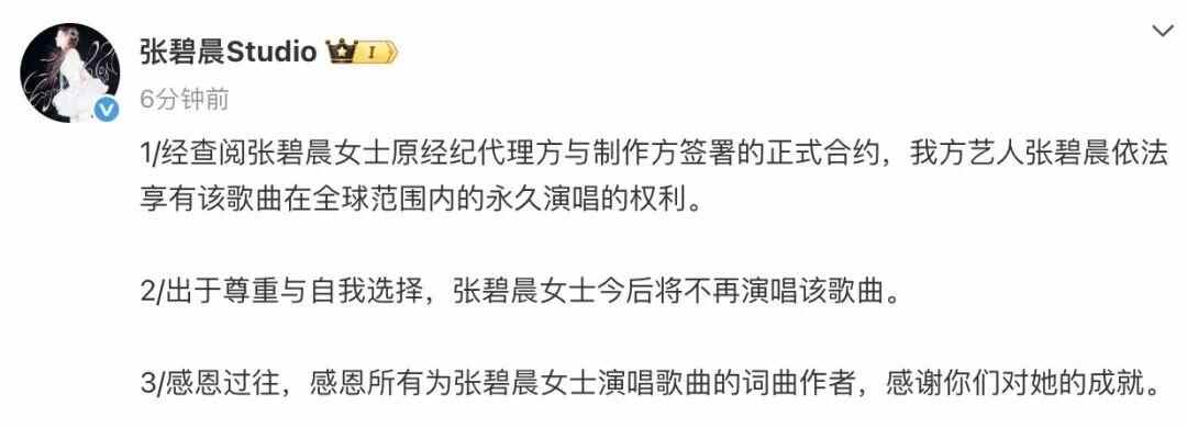7月25日,@张碧晨Studio 发文回应:“1.经查阅张碧晨女士原经纪代理方与制作方签署的正式合约,我方艺人张碧晨依法享有该歌曲在全球范围内的永久演唱的权利。2.出于尊重与自我选择,张碧晨女士今后将不再演唱该歌曲。3.感恩过往,感恩所有为张碧晨女士演唱歌曲的词曲作者,感谢你们对她的成就。”