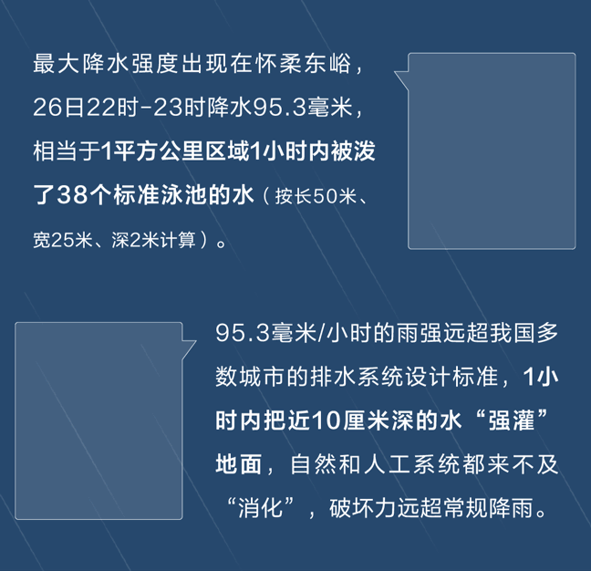 最强的小时雨量达到95.3毫米,相当于1平方公里区域1小时内被泼了38个标准泳池的水(按长50米、宽25米、深2米计算),直接“硬灌”近10公分深的水在地面。