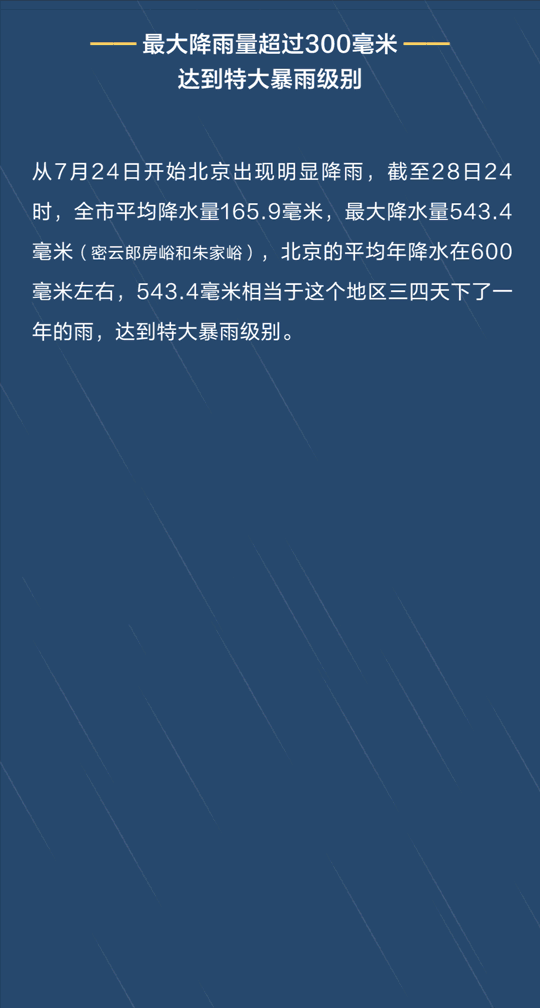 北京的平均年降水在600毫米左右,543.4毫米相当于四天下了近一年的雨。