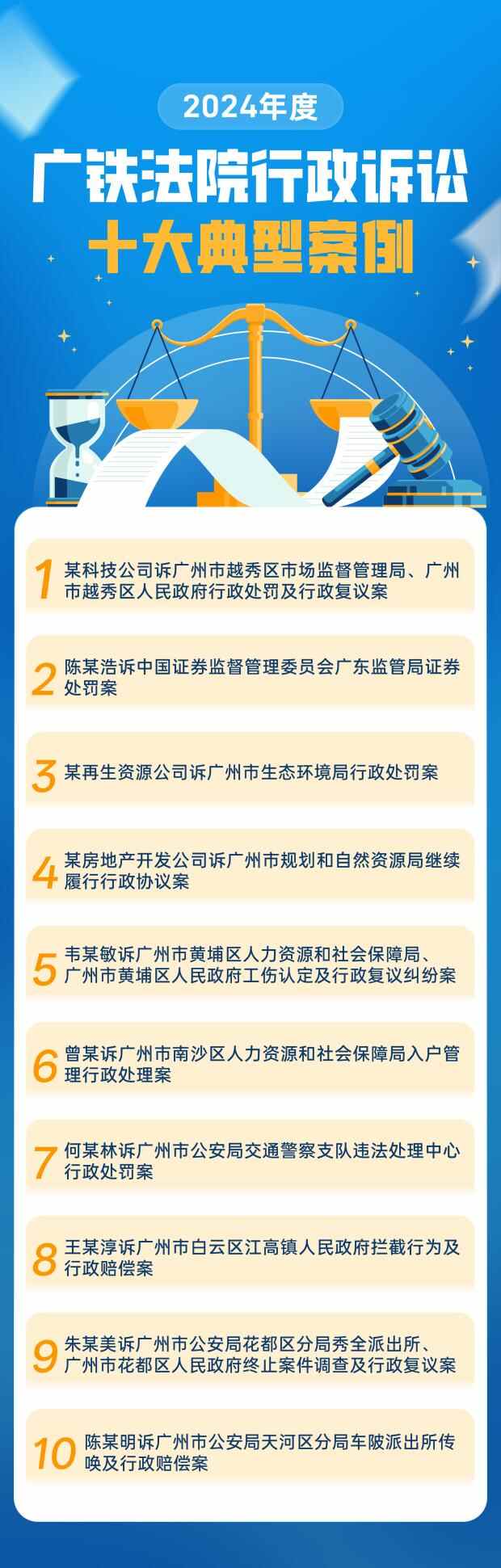 同时,广州铁路运输中级法院发布2024年度行政诉讼十大典型案例。其中,既有依法支持行政机关查处互联网平台违法发布烟草广告、上市公司监事未勤勉履行信息披露管理职责、再生资源企业未经许可收集危险废物和利用虚假证书违法申请人才入户等方面案件,也有监督行政机关诚信履行行政协议、依法作出工伤认定和审慎开展治安管理等方面案件,体现人民法院监督、纠正违法行政行为与支持促进依法行政有机统一。