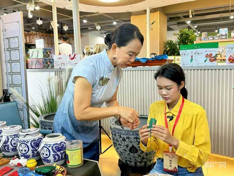 在兴安领创展示体验中心二楼的非遗古法制香区,围满了参观的游客,闫海杰—非遗古法制香第三代传承人,此刻她正在为游客讲解制作蒙药香包的方法。