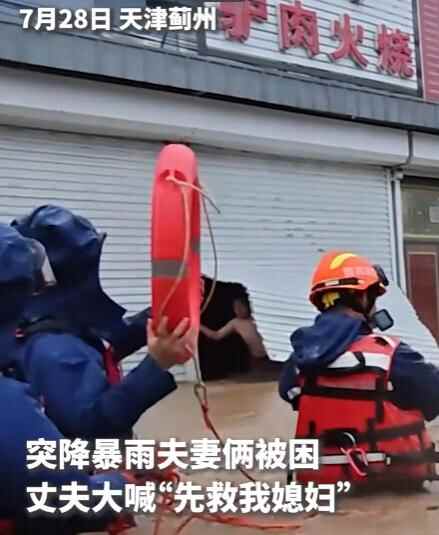 7月28日,天津蓟州突降暴雨,夫妻俩被困,丈夫大喊“先救我媳妇,我会游泳”。激流中丈夫紧紧护住妻子,让消防员先救妻子。这一幕令人动容!
