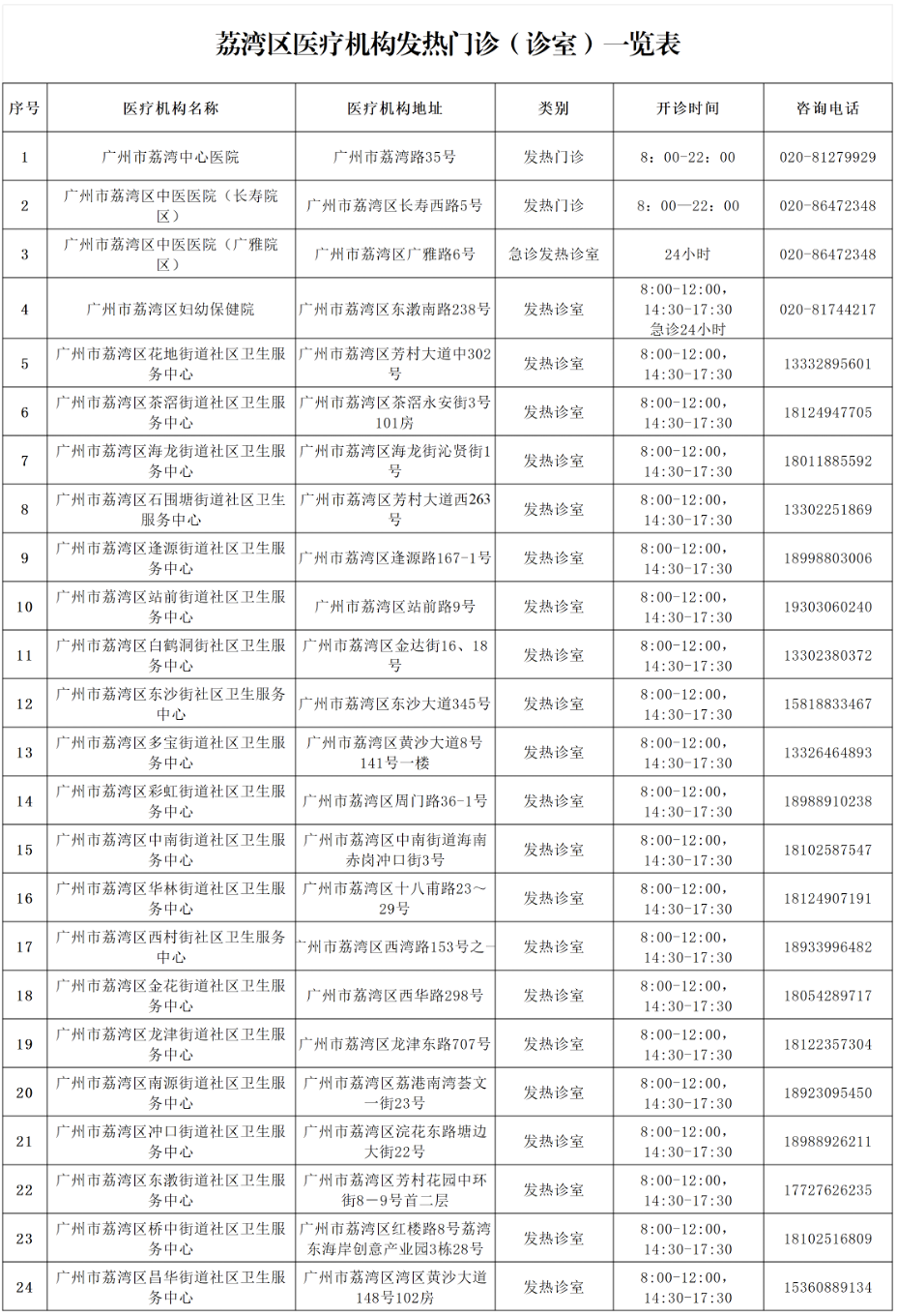 同时,荔湾区发热门诊(诊室)信息如下,患者前往就诊后,如经初筛疑似阳性,可直接通过荔湾区紧密型医疗集团上下转诊机制直转荔湾中心医院就诊。