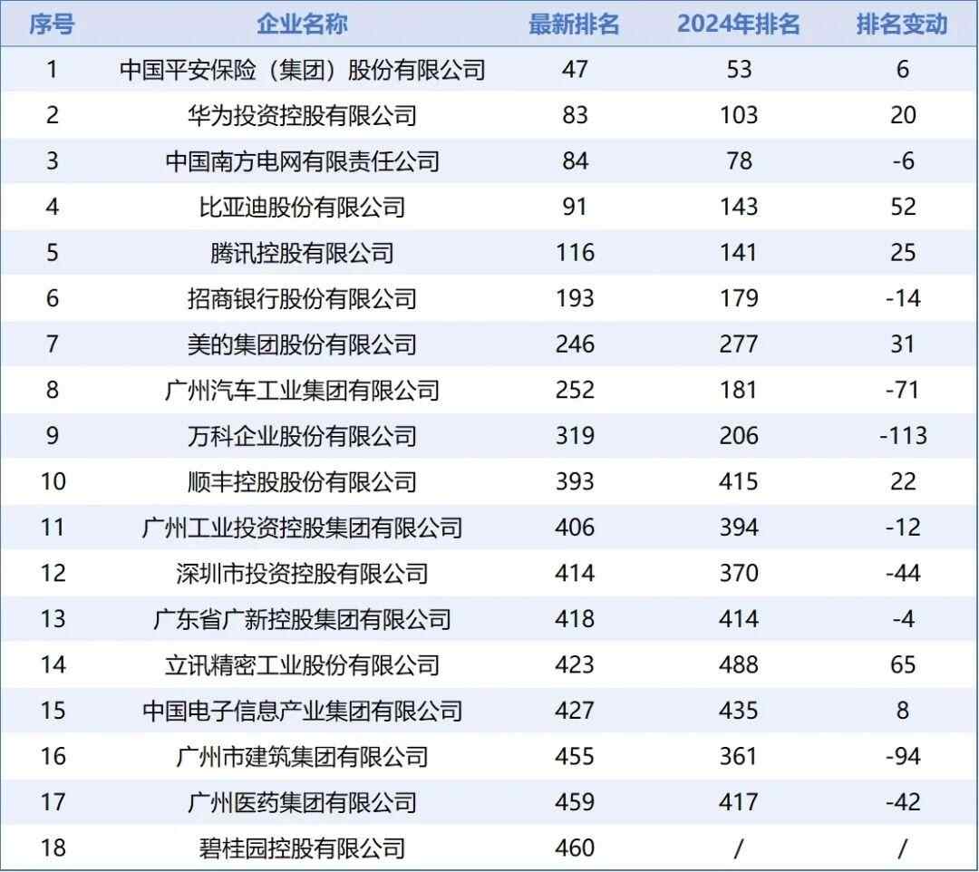 广东全省共有18家企业登上《财富》世界500强排行榜,比去年增加1家。总部位于佛山的碧桂园于2024年短暂跌出榜单后,今年重回榜单,位列第460位。中国平安、华为、南方电网、比亚迪冲进榜单前100名,其中比亚迪为首次进入前100位。