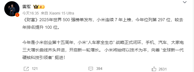 7月29日,@小米公司发文:2025《财富》世界500强出炉,小米位列第297位,连续7年上榜!较去年大幅提升100位,创下2019年入榜以来最大涨幅,这份成绩,离不开每一份信任与支持!