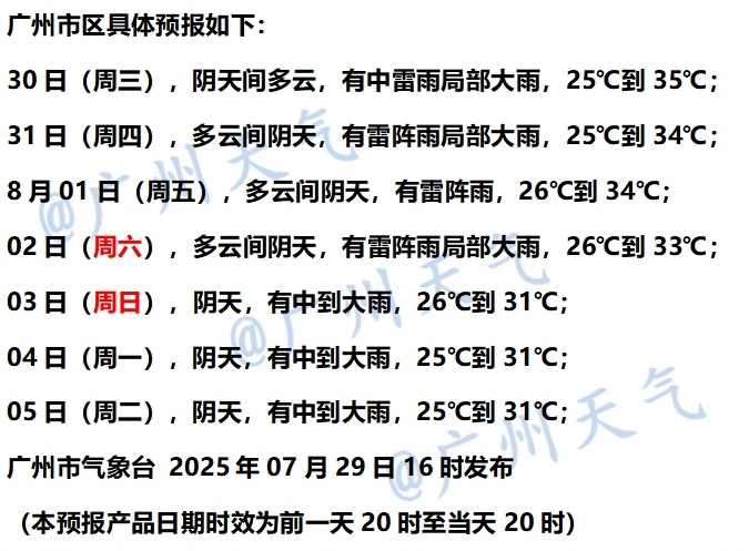 7月30日(周三),阴天间多云,有中雷雨局部大雨,25℃到35℃;