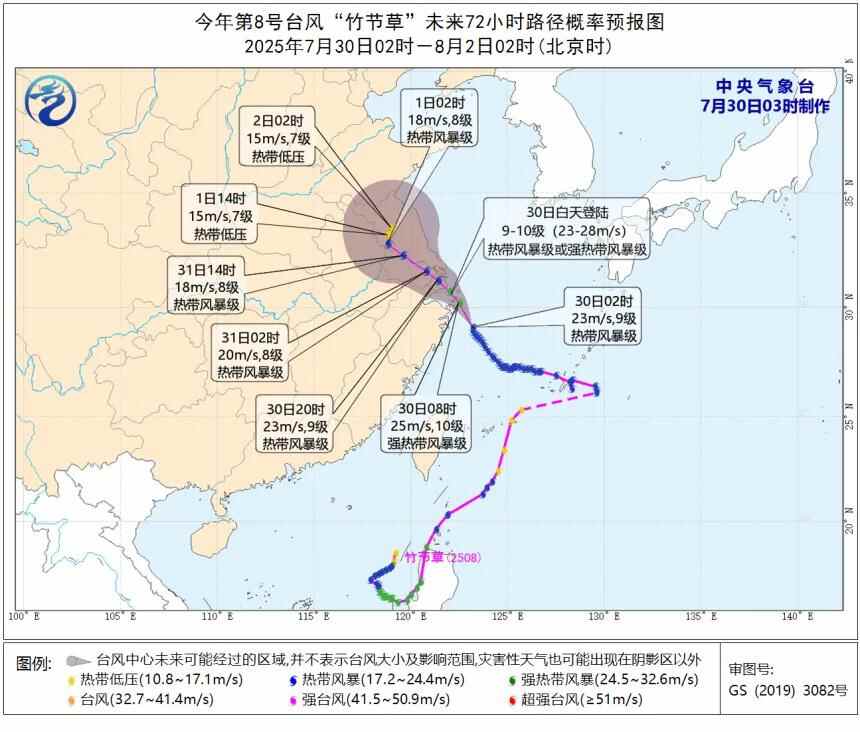 再来看看“复活”的台风——“竹节草”的消息。今年第8号台风“竹节草”(热带风暴级)的中心已于7月30日4时30分前后在浙江省舟山市朱家尖岛沿海登陆,登陆时中心附近最大风力有9级(23米/秒),中心最低气压为975百帕。