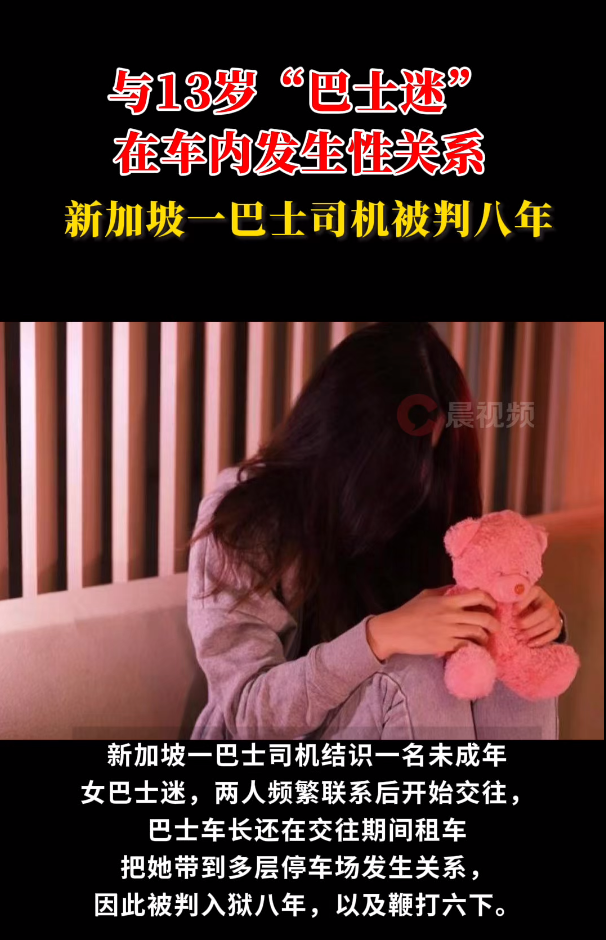 近日,新加坡一巴士司机与13岁“巴士迷”在车内发生性关系,被判八年,引发社会关注。据悉,新加坡一巴士司机结识一名未成年女巴士迷,两人频繁联系后开始交往,巴士车长还在交往期间租车把她带到多层停车场发生关系,因此被判入狱八年,以及鞭打六下。