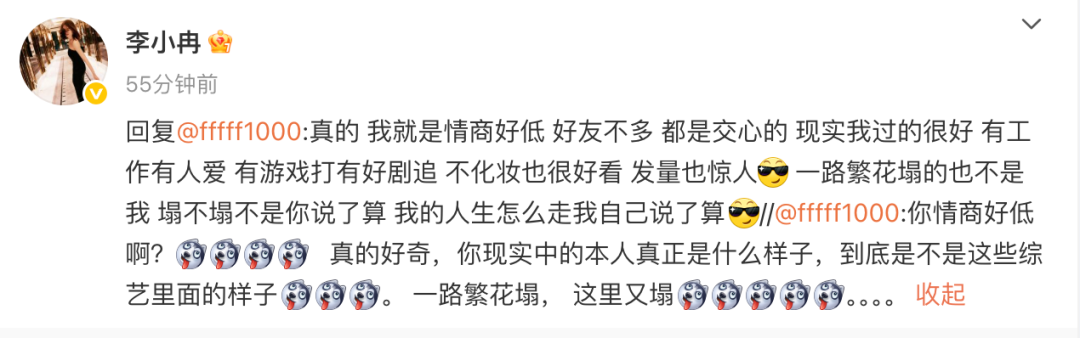 随后,李小冉针对网友说她“情商好低”“一路繁花塌,这里又塌”,转发回复道:我就是情商好低,好友不多,都是交心的,现实我过的很好,有工作有人爱,有游戏打有好剧追,不化妆也很好看,发量也惊人,一路繁花塌的也不是我,塌不塌不是你说了算,我的人生怎么走我自己说了算。
