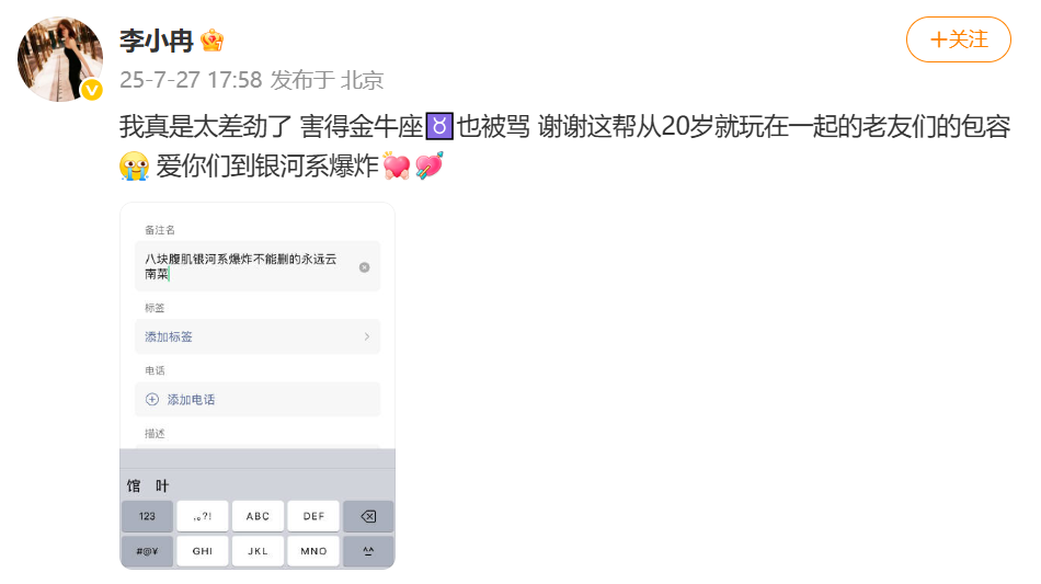 当天下午,李小冉转发视频并发文:“啊啊啊一觉醒来,以为天又塌了,哈哈哈,已经备注:八块腹肌不能删。”“谢谢这帮从20岁就玩在一起的老友们的包容 爱你们到银河系爆炸。”