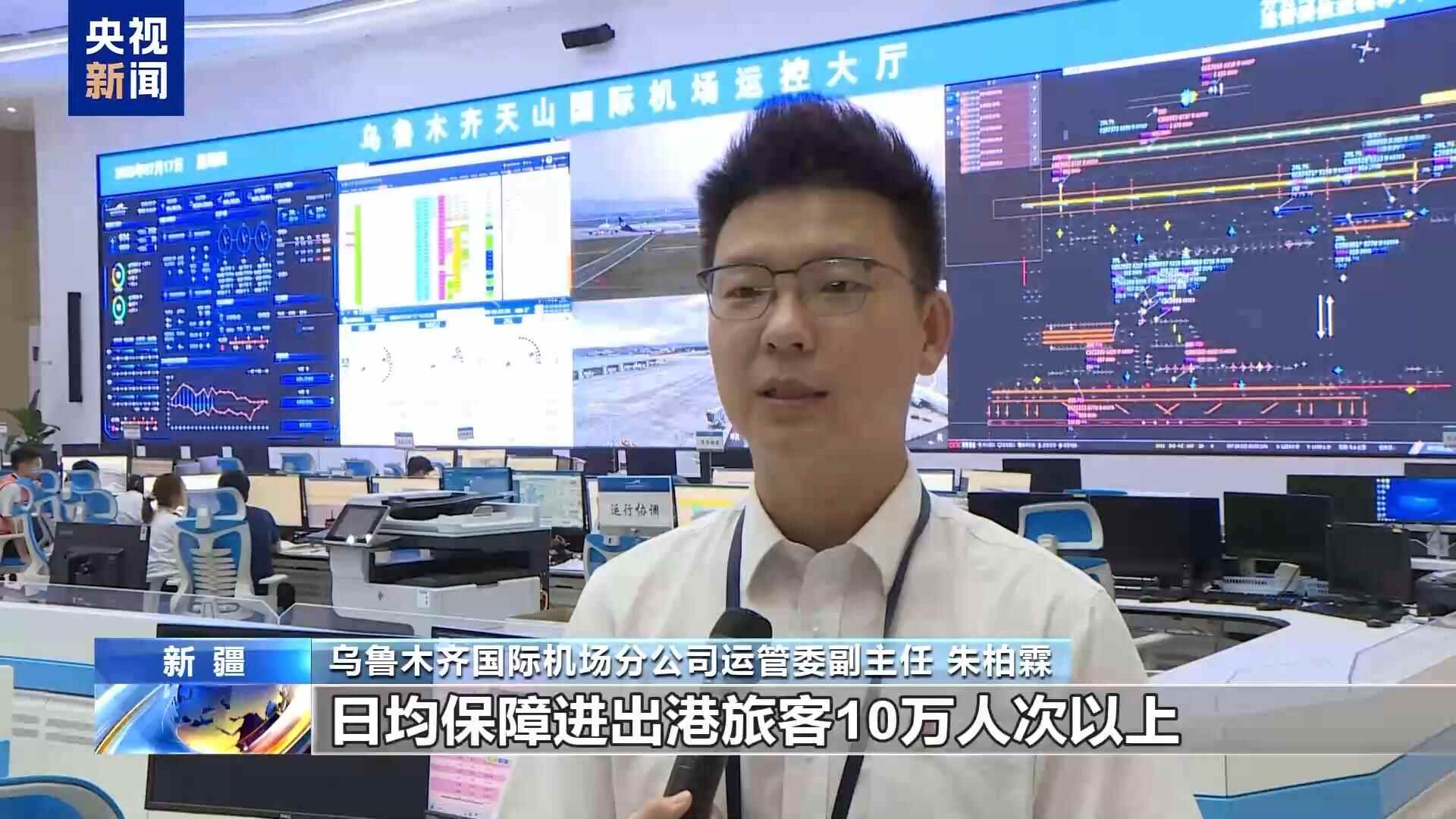 乌鲁木齐国际机场分公司运管委副主任 朱柏霖:暑运以来,乌鲁木齐天山国际机场日均保障进出港旅客10万人次以上,日均保障航班起降600架次以上,其中,运行宽体机数量占全天总架次的27%,远超去年同期水平。