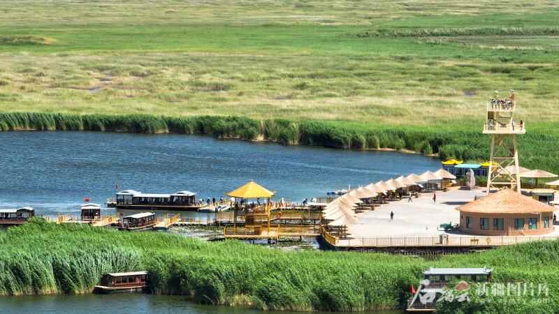当天,博斯腾湖莲海世界景区内碧波荡漾,万亩睡莲竞相绽放,成片的芦苇随风摇曳,微风过处,绿浪翻涌,鹭鸟翩飞。朵朵绽放的睡莲与碧蓝的湖面、起伏的沙丘、连片的芦苇交相辉映,游客乘船荡漾其间,呈现出一幅“船在湖中行,人在画中游”的生态画卷。