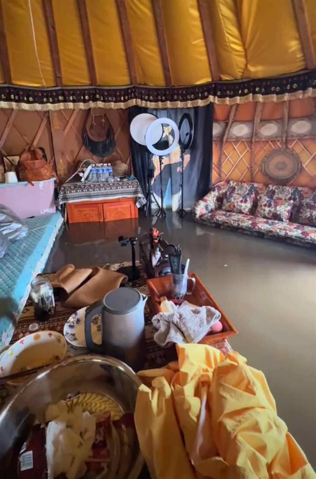 洪水涌进蒙古包(视频截图)