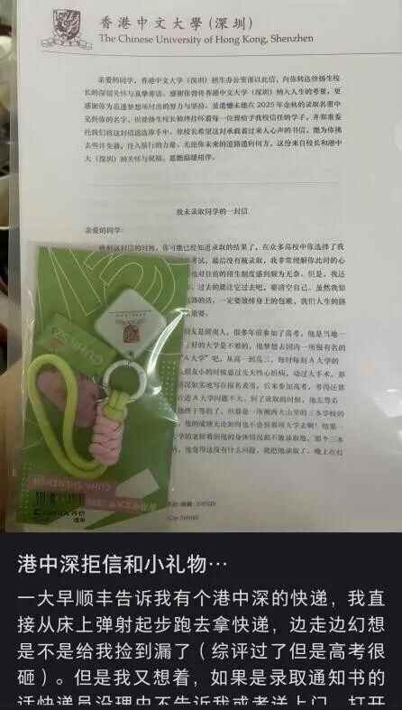 多名网友表示意外收到了香港中文大学(深圳)邮寄的“未录取通知书“,内含徐扬生校长的一封信,还有一个印着该校logo的小礼物。