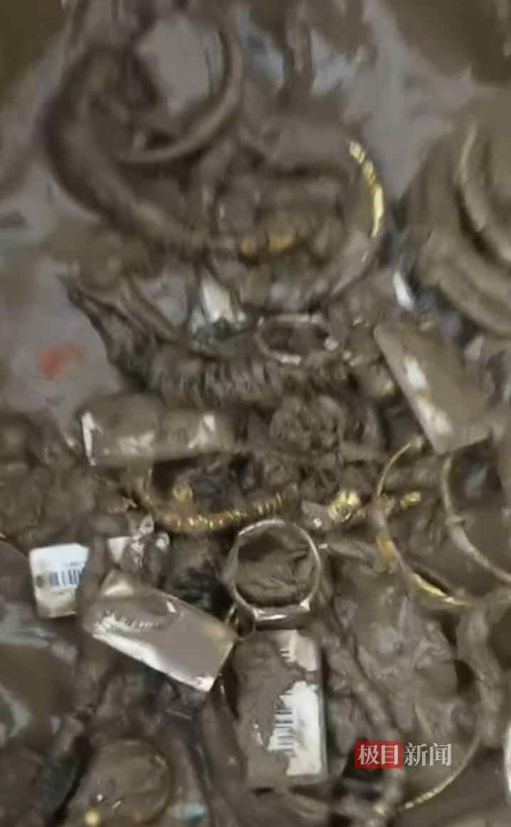多人主动归还捡到的金银首饰。叶国福提到,27日,在金店附近参与清淤的公职人员、志愿者、群众捡到几件首饰,归还时,他们婉拒了店方的酬金,不求回报。令他印象最深的是,一名10岁的儿童捡到一个金耳饰,跑到店里主动归还,也不要酬金,“我很感动,也很感谢他们。”图片显示,归还的金银首饰包括金耳饰、铂金钻戒、银手镯等。