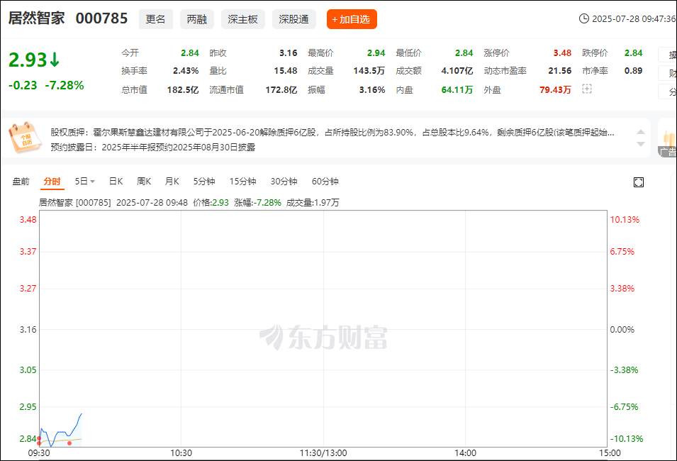 今日,居然智家(sz000785)开盘跌停,报2.84元。