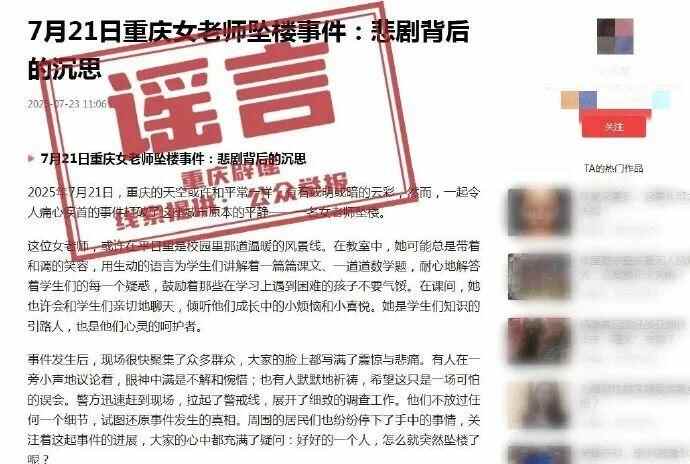 近日,网民张某某编造发布“7月21日重庆女老师坠楼事件:悲剧背后的沉思”的谣言信息。
