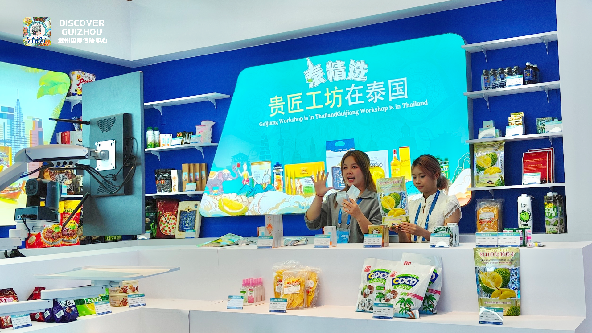 交流周现场,贵州电子商务职业技术学院“贵匠工坊”展位上,来自泰国博仁大学经贸中文系的学生肖梦心和张娜玲正“变身”主播,热情洋溢地向观众推荐泰国特色产品。
