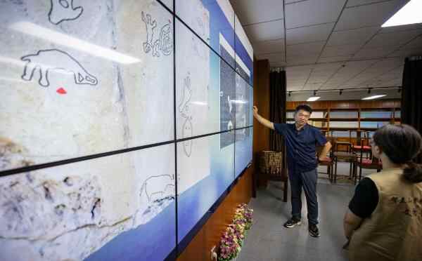 7月23日,工作人员在银川世界岩画馆研究室研究贺兰山岩画数字拓片。